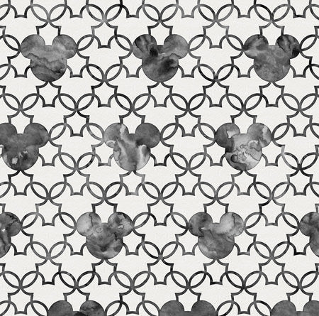 Unique Disney-inspired pattern showing interlocking Mickey Mouse heads in beautiful ink black watercolor on a light background.