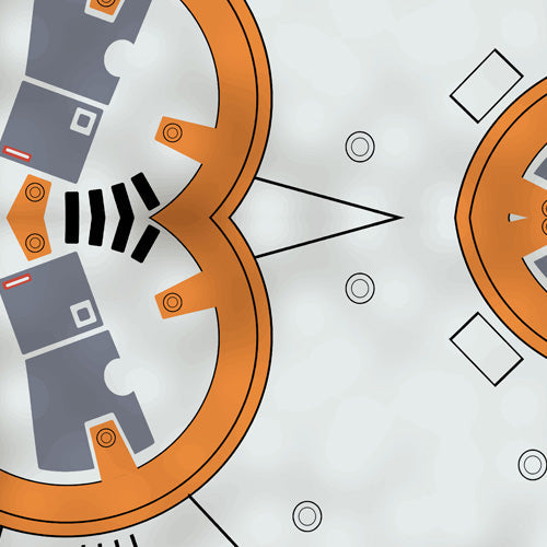 Roll into your day with this fun design inspired by a certain brave little round droid. Featuring energetic splashes of orange and gray with galactic flair, it’s perfect for anyone who knows life’s better with a few beeps and boops.