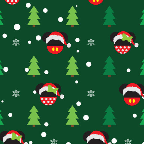 Perfect for the holidays, this cute pattern on a green background shows Santa Mickey and Minnie ears surrounded by pine trees and snow flakes!