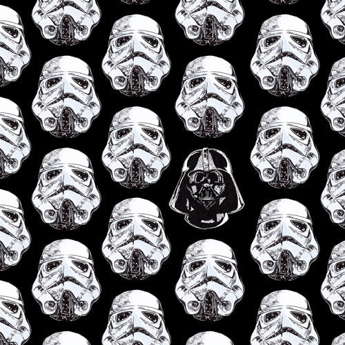 Spot Darth Vader amongst all the Storm Troopers! Featuring large hand drawn helmets on a black background.