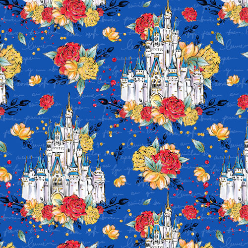 Showing a hand-drawn version of the beautiful Cinderella Castle from Disney World, surrounded by happy flowers on a blue background. This is an officially licensed Karamfila design.