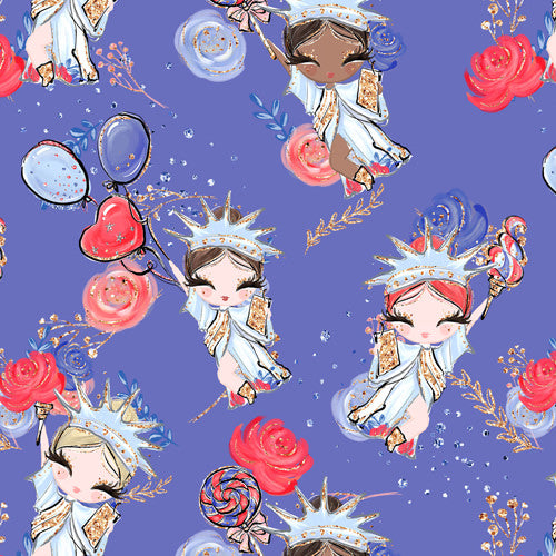 Inspired by the Statue of Liberty, this American patriotic print shows hand-drawn Lady Liberty holding flowers, candies, and balloons. This is an officially licensed Karamfila design.