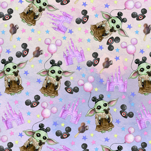 Hand-drawn watercolor print showing everyone's favorite alien Child enjoying a day at a Disney theme park!