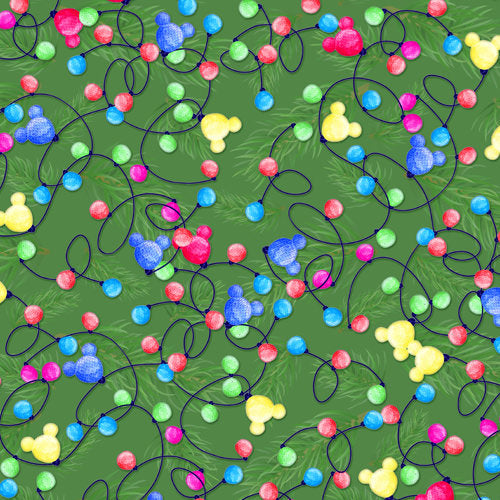 This lively design showcases a festive tangle of Christmas lights adorned with Mickey-shaped bulbs, all set against a lush green fir pine background. A whimsical way to brighten up the holidays with a touch of Disney magic!