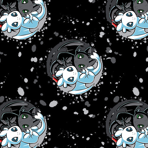 Inspired by Toothless and his mate Light Fury from the How To Train Your Dragon movies, this print shows the two dragons in a yin-yang position on a black background.