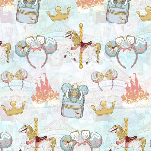 Celebrate the timeless charm of Disney carousels with this whimsical design inspired by the Minnie's Main Attraction series. Featuring elegant carousel horses, glittering Minnie ears, royal crowns, and the iconic castle backdrop, this pattern is a delightful nod to the magic of fantasy and nostalgia. Perfect for Disney enthusiasts who love classic attractions!