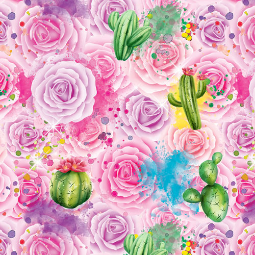 Inspired by Isabela's pretty dress and her gifts from the Disney hit Encanto, this pattern shows pink roses dotted with colorful paint splashes and cacti.