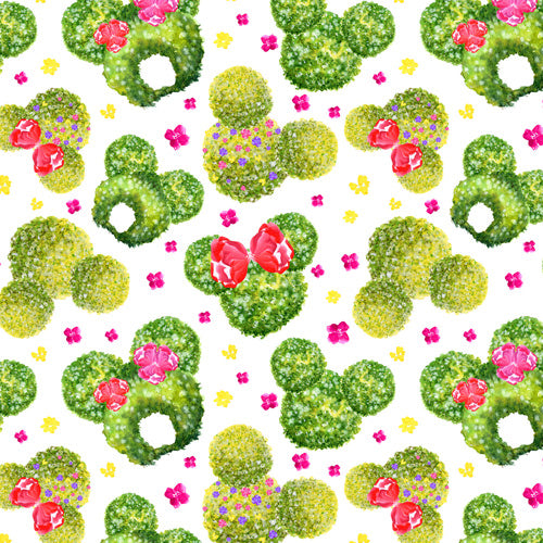 Inspired by Epcot's Flower & Garden Festival with its beautiful flowers and sculpted topiaries, this print shows topiaries shaped like Mickey and Minnie in a watercolor style on a white background.