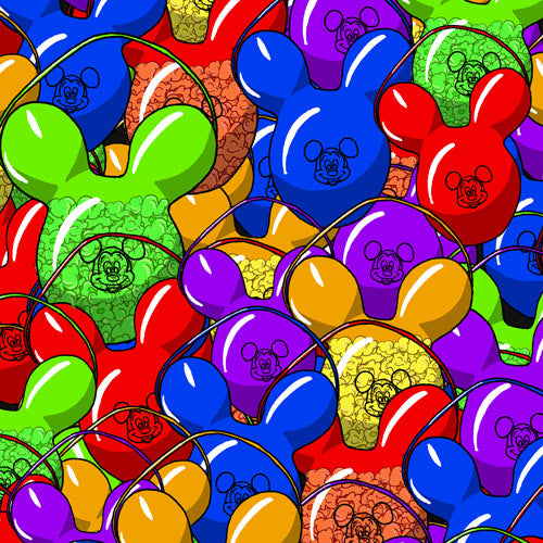 Colorful Disney themed popcorn buckets fill this print, featuring green, red, blue, purple, and yellow mouse ears popcorn buckets.