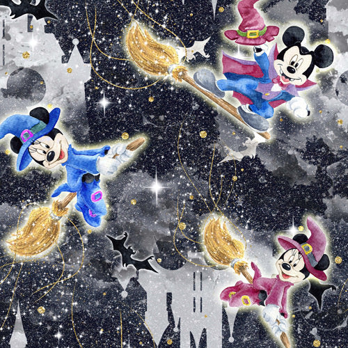 Mickey and Minnie Mouse take to the Halloween sky in their vampire and witch costumes in this Disney-inspired Halloween themed print.