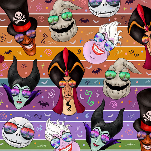 This playful Disney-inspired design celebrates the villains we love to hate, featuring stylized depictions of Ursula, Maleficent, Dr. Facilier, and the Evil Queen against colorful, striped backgrounds. The vibrant hues and whimsical details, including bats and swirling patterns, add a mischievous charm to the artwork. A fun and quirky homage to Disney's iconic villains!