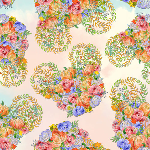 Beautiful fall and Halloween inspired print, showing hand-drawn watercolor pumpkins in pastel shades of orange, blue, and pink.