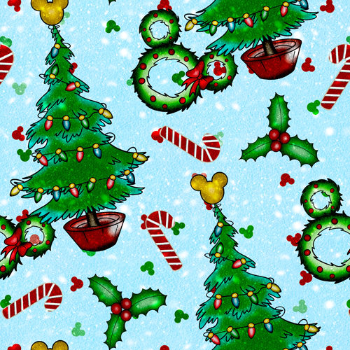 Christmas themed print with mouse ears wreaths, candy canes, and Christmas trees with a Mickey tree topper!