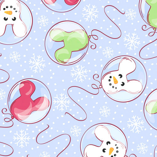 This print is perfect for winter time in Disney, showing snowman and mouse ears balloons and snow flakes on a blue background.