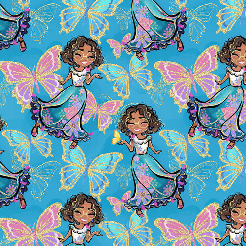 This print features Mirabel from Disney's Encanto in an adorable whimsical hand-drawn style on a blue butterfly background!