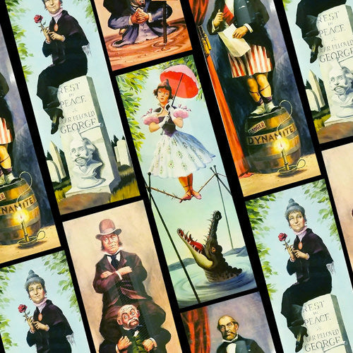 Bring a touch of playful spookiness to your day with this bold design inspired by vintage portraits of a certain stretching room. Featuring quirky characters like the daring tightrope walker, the sinking quicksand duo, the dynamite gentleman, and the mysterious widow, it’s perfect for anyone who loves a little eerie elegance with their everyday style.