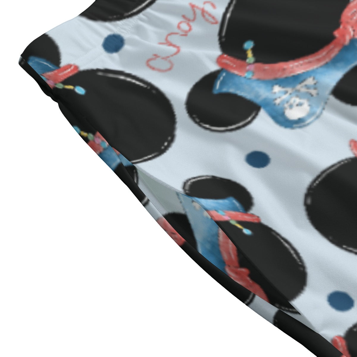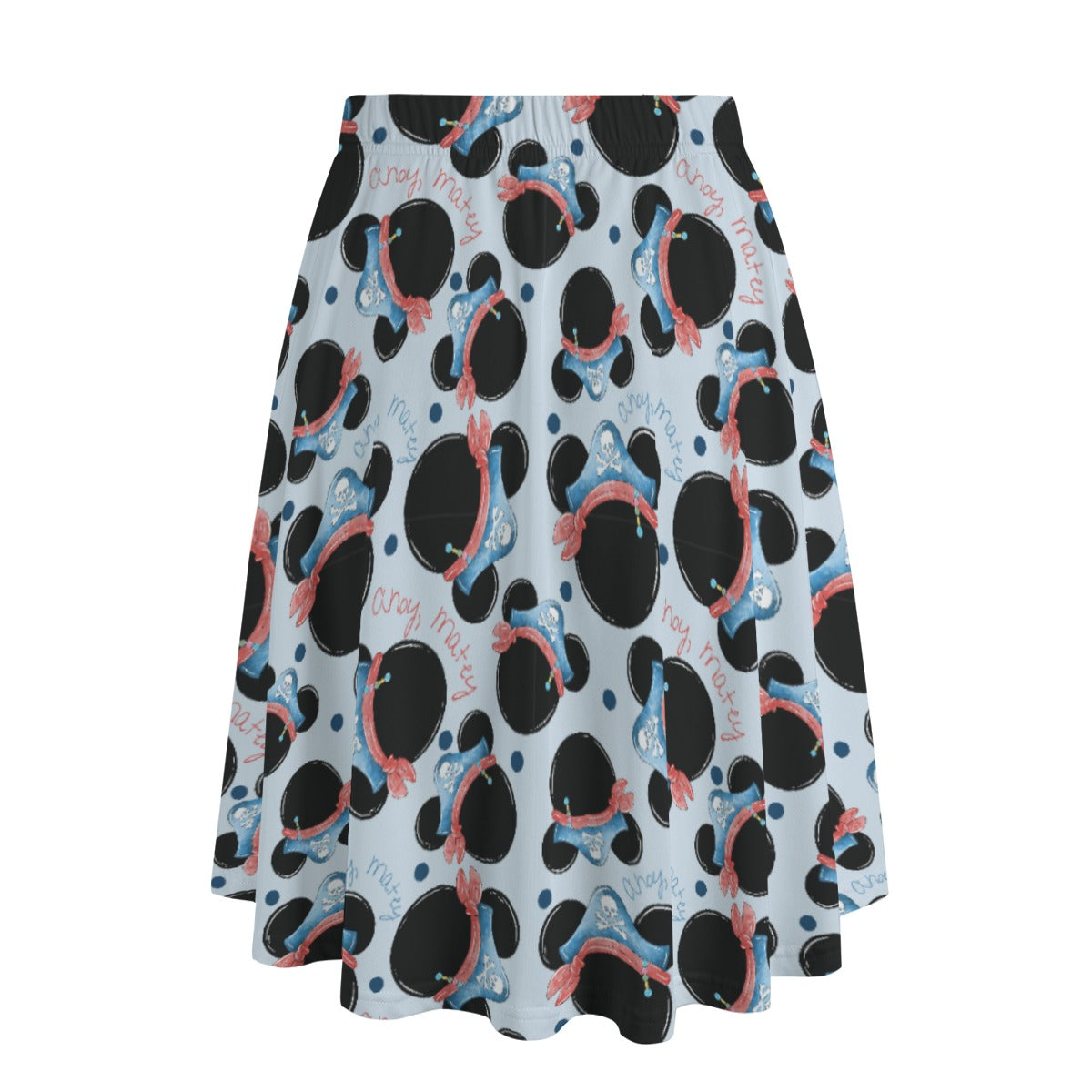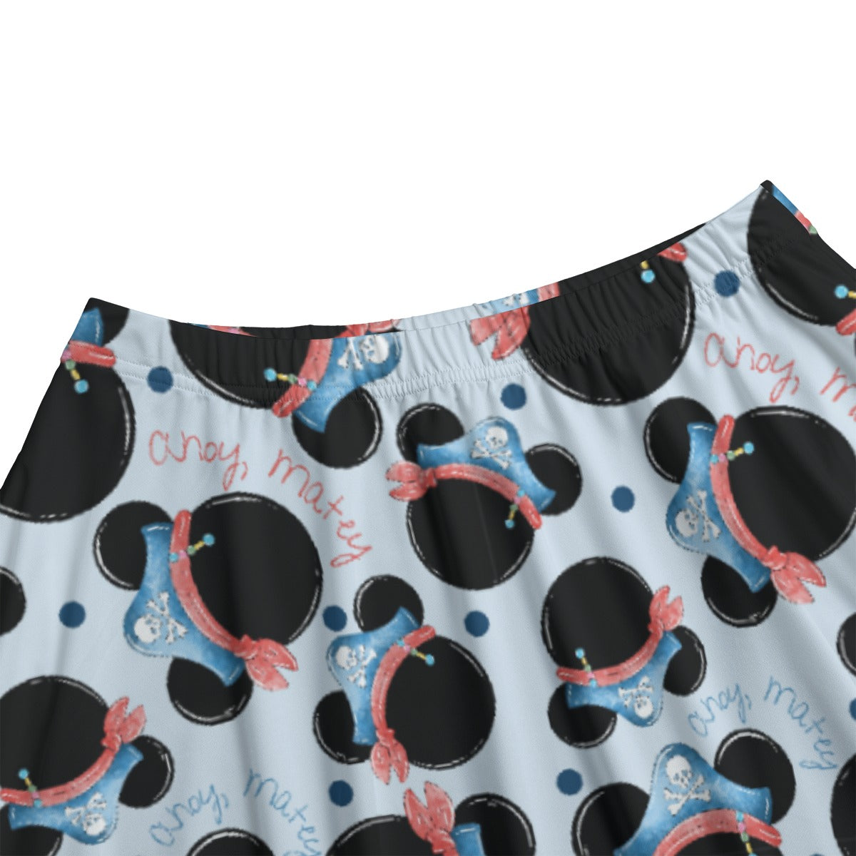 Ahoy, matey! This swashbuckling design features classic mouse-ear silhouettes dressed in pirate bandanas and skull-and-crossbones hats, sailing across a sea of soft blues and cheerful reds. Perfect for fans of high-seas adventure and nautical fun with a whimsical twist.