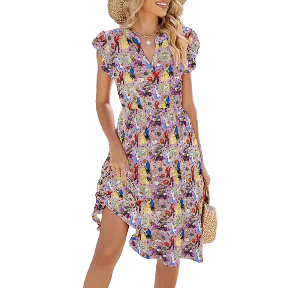 This charming hand-drawn print captures the elegance of a classic love story—featuring a curious girl, a gentle beast, a glowing candelabra, a charming teacup, and a devoted teapot in sketched watercolor style. With swirls of pink and glimmers of gold, it’s a timeless tale with extra flair.
