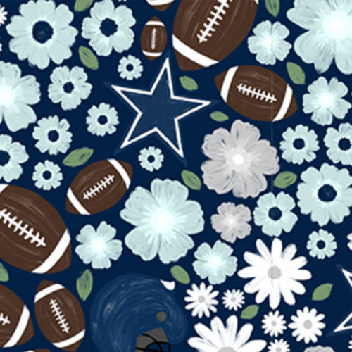 Game day just got a whole lot prettier! This pattern combines iconic navy and white with soft, painterly florals in white, pale blue, and sage green. Footballs and a legendary star emblem are scattered throughout the blooms, giving it that perfect balance of sporty and feminine. The hand-painted watercolor style on a deep navy background makes it feel fresh, bold, and ready for tailgates, watch parties, or just showing off your team pride in style. It's tough, it's pretty, and it's 100% fan-ready.