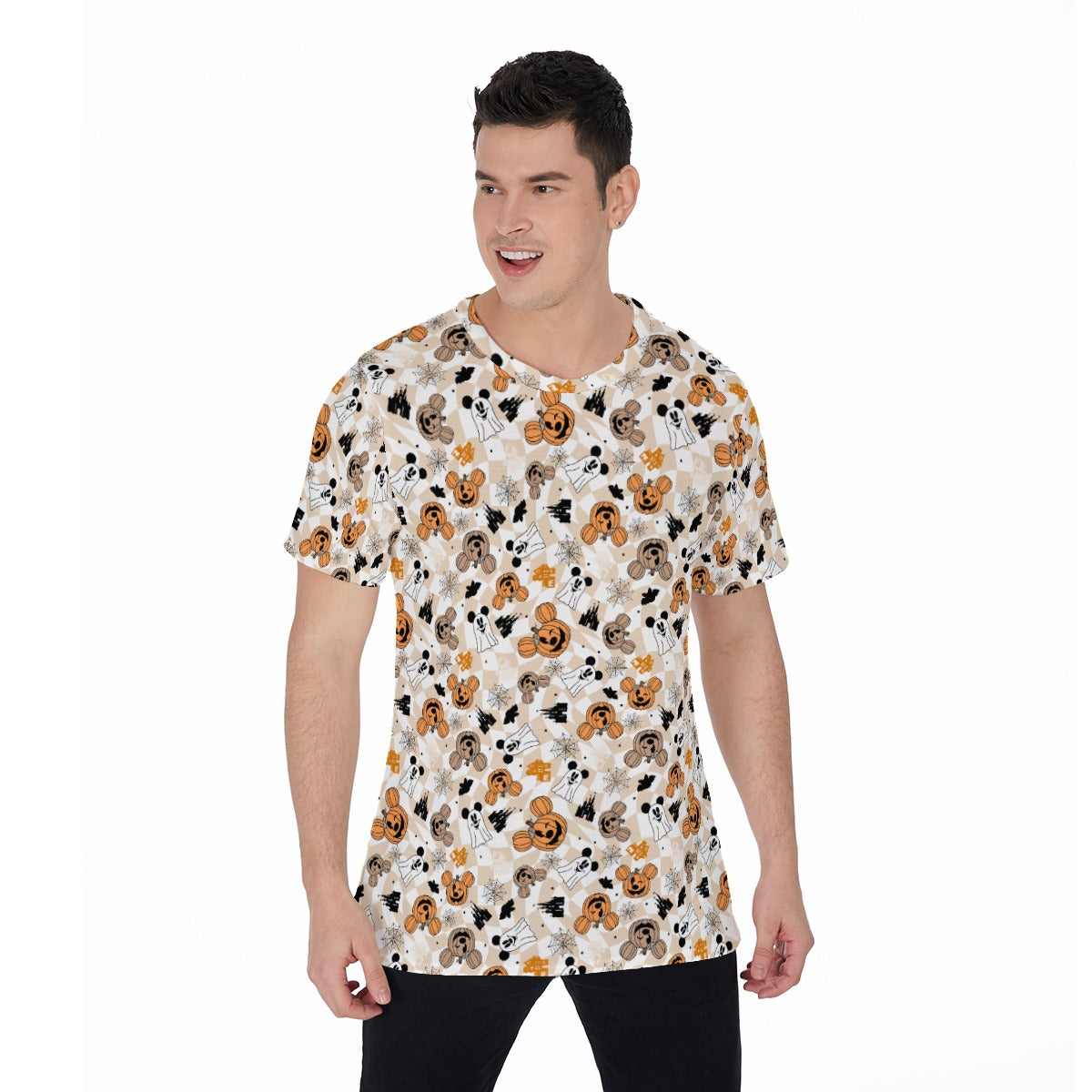 A delightfully eerie print filled with ghostly mouse ear shapes, glowing pumpkins, castles, and haunted houses on a neutral checkered swirl background. Cute meets spooky in this magical Halloween design that’s perfect for festive celebrations.