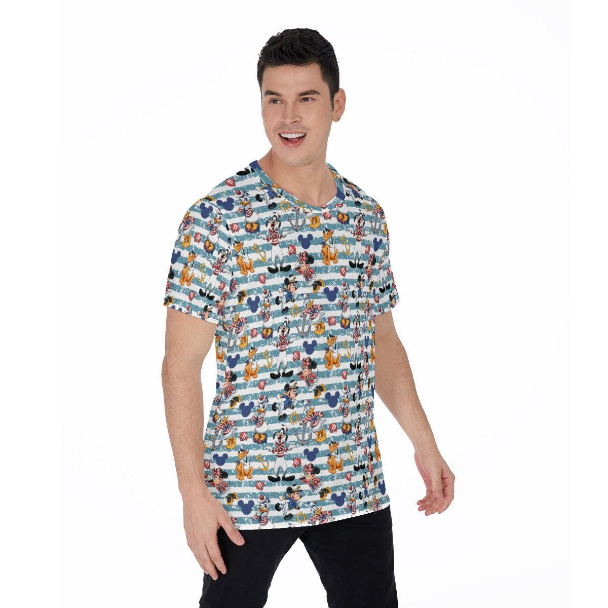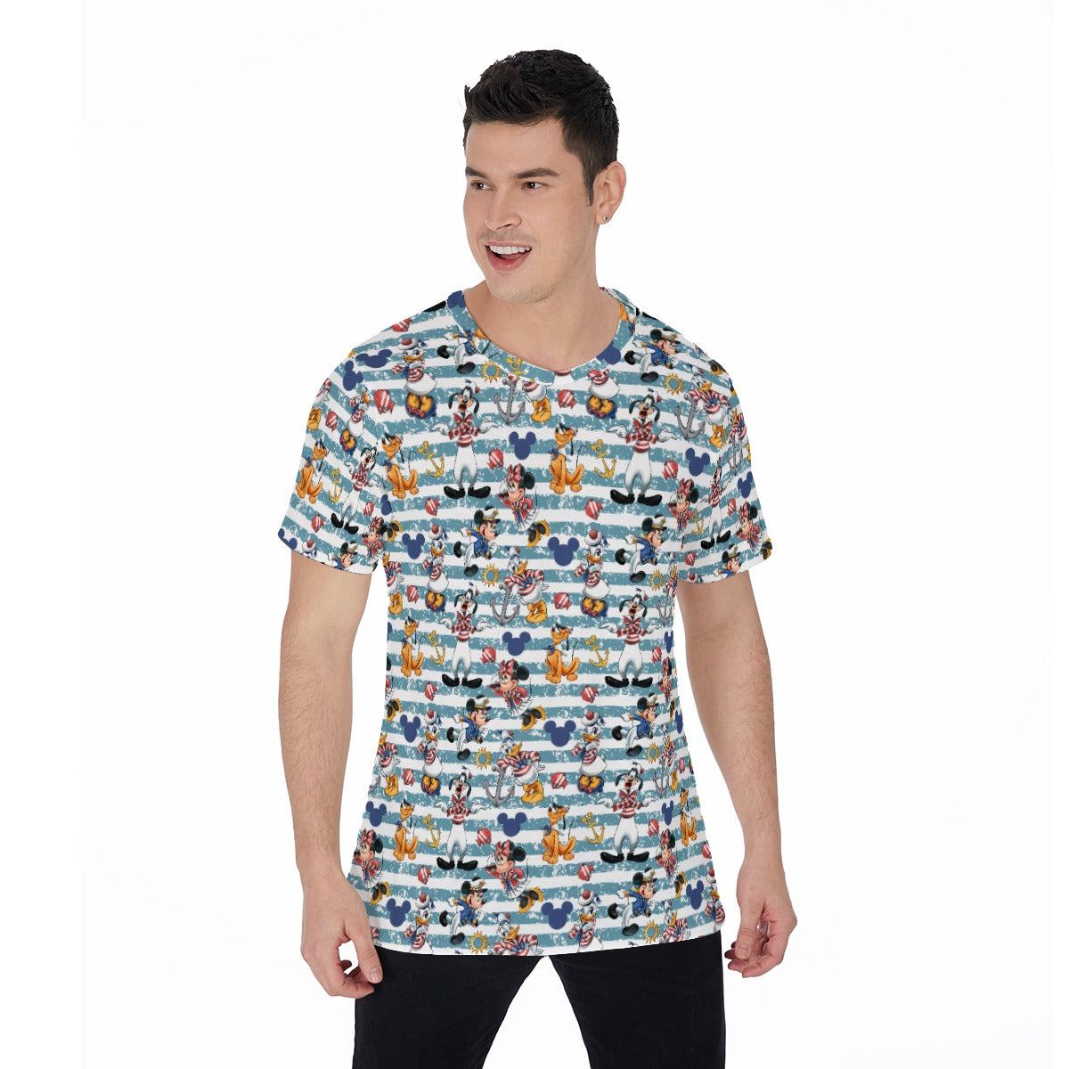 Anchors aweigh with this bold striped design featuring a full cruise crew decked out in their finest seafaring style. Sunny icons and whimsical ear-shaped touches add magic to any ocean getaway.