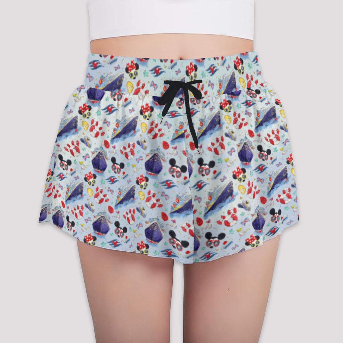 Anchors aweigh with this playful design packed with iconic cruise ships, mouse-shaped sunglasses, nautical life preservers, and tropical treats inspired by sunny voyages. A splashy celebration of sailing in fun and stylish fashion.