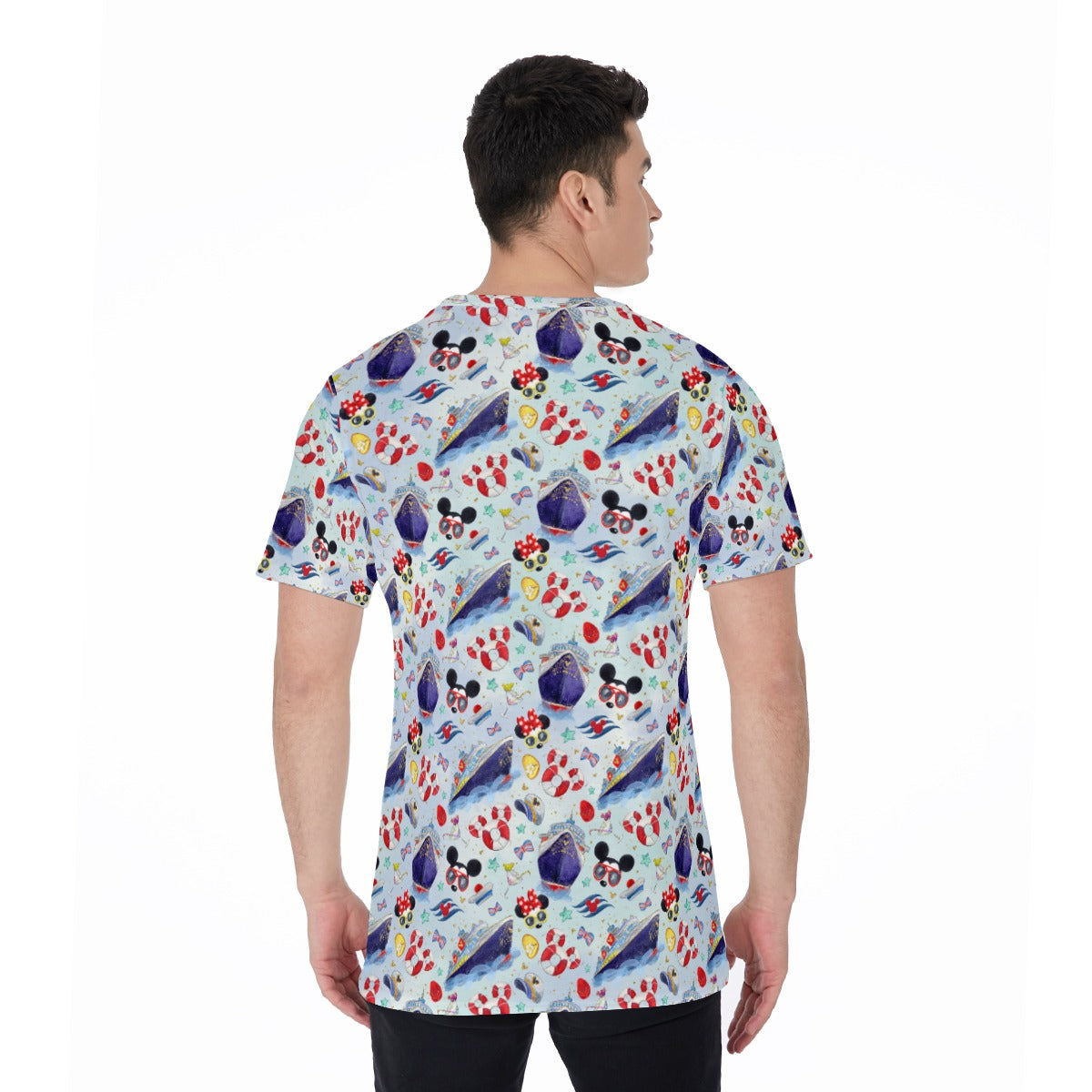 Anchors aweigh with this playful design packed with iconic cruise ships, mouse-shaped sunglasses, nautical life preservers, and tropical treats inspired by sunny voyages. A splashy celebration of sailing in fun and stylish fashion.