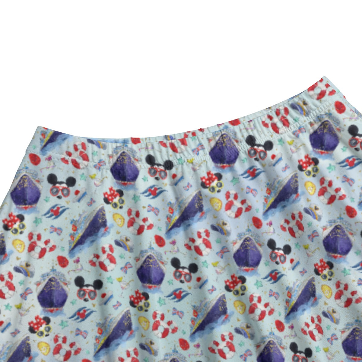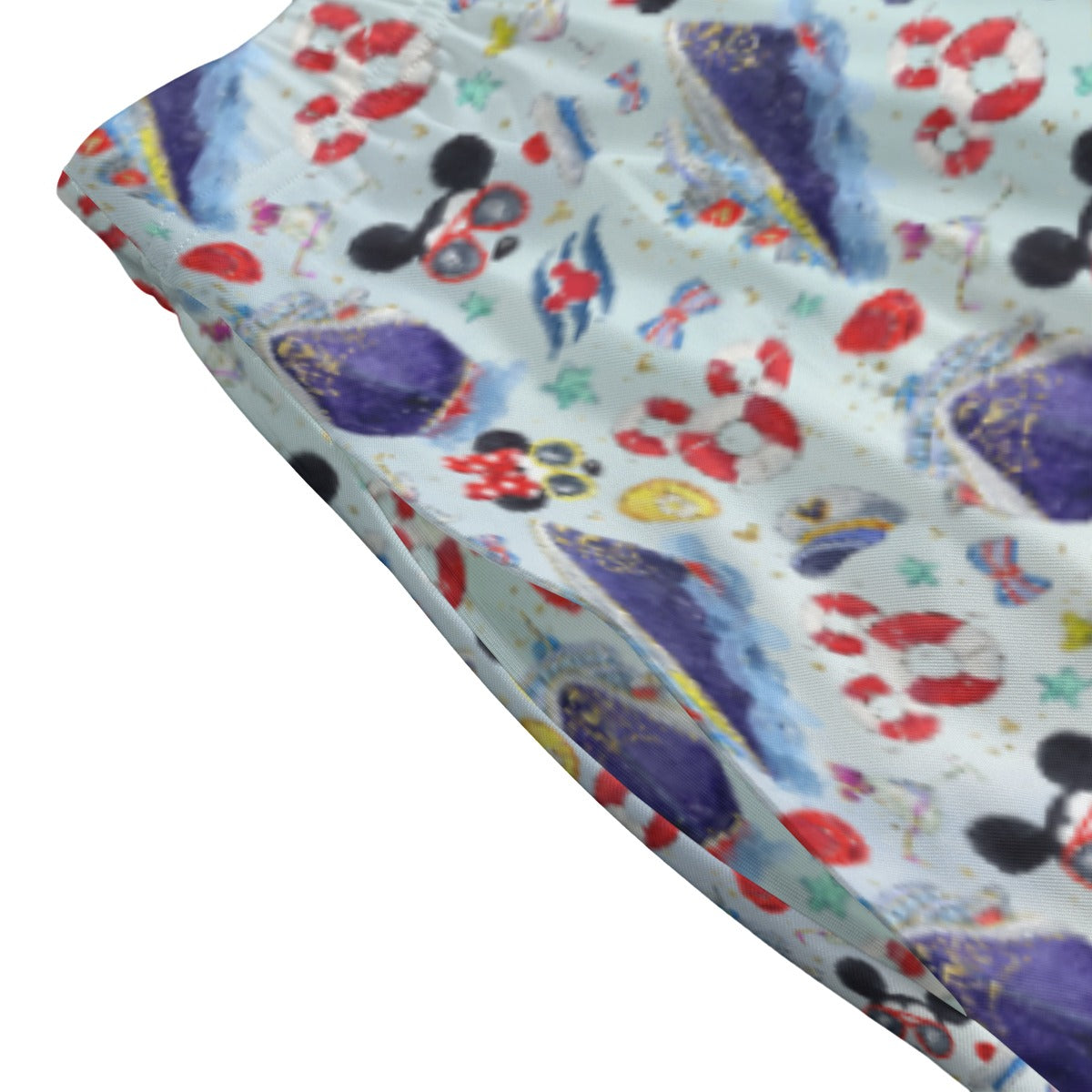 Anchors aweigh with this playful design packed with iconic cruise ships, mouse-shaped sunglasses, nautical life preservers, and tropical treats inspired by sunny voyages. A splashy celebration of sailing in fun and stylish fashion.