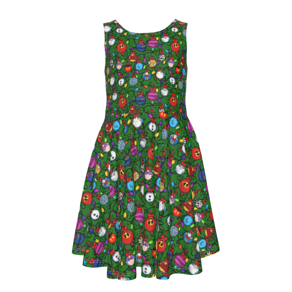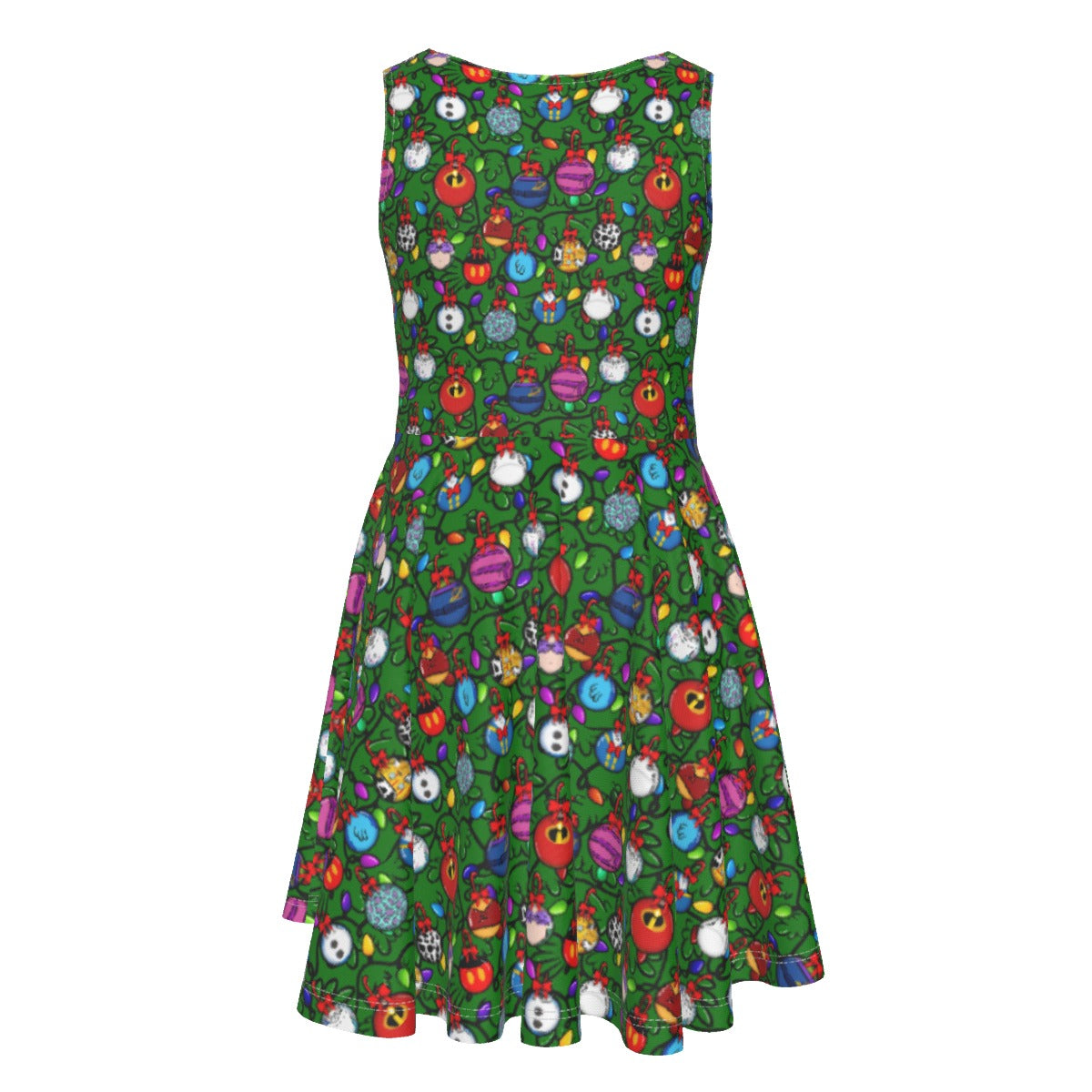 Festive Character Baubles on Green - Kid's Sleeveless Skater Dress