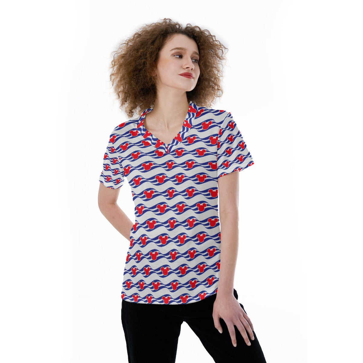 Anchors aweigh with this crisp nautical print featuring bold red mouse-ear silhouettes floating atop navy wave stripes. A shipshape design perfect for fans of ocean adventures and maritime dreams.