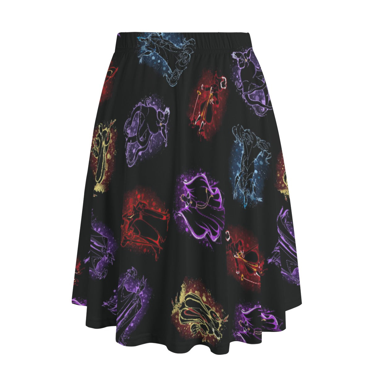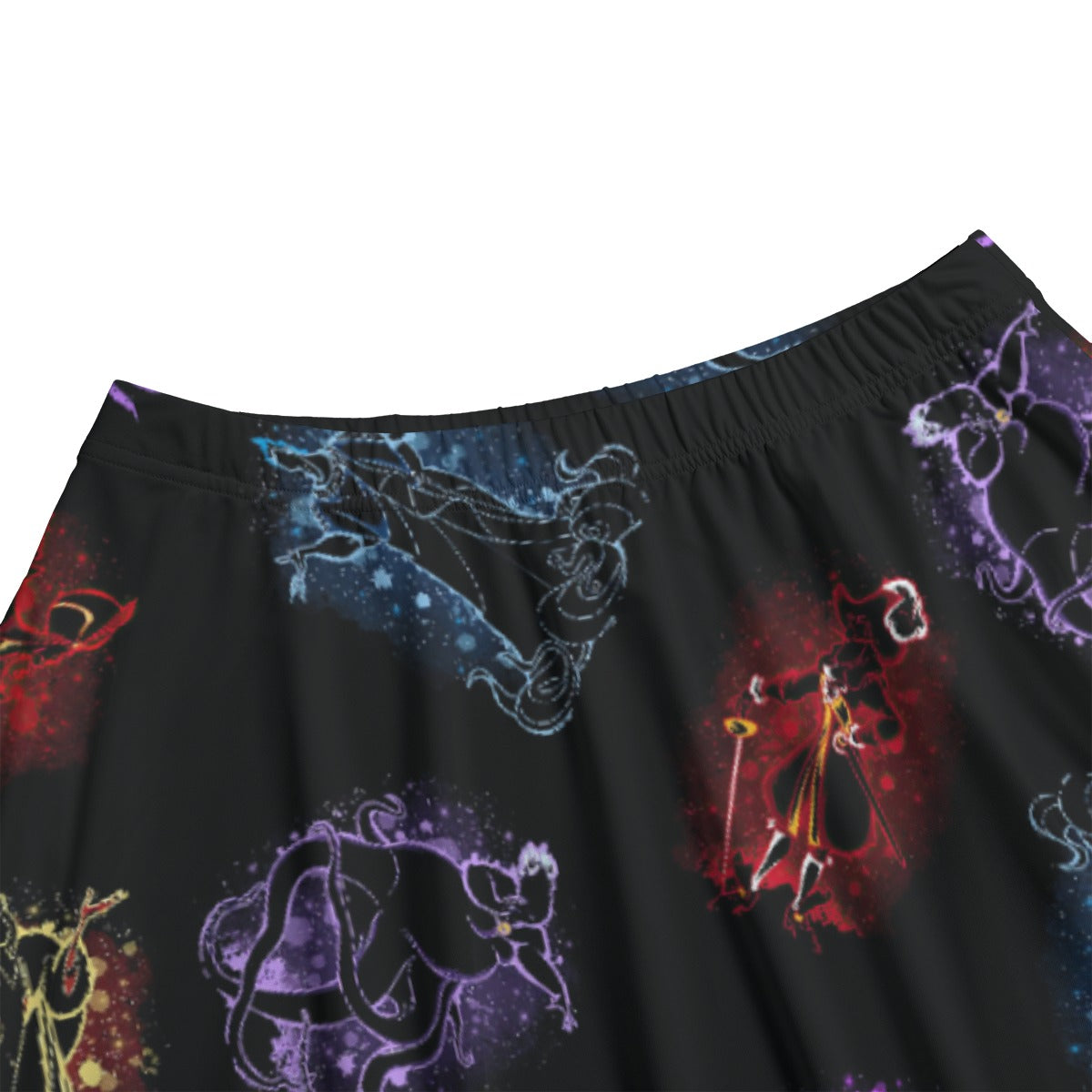 Celebrate your fierce side with this dramatic print featuring glittery silhouettes of iconic villainous characters. Bold outlines in red, purple, and icy blue pop against a deep black backdrop, creating a glam and delightfully wicked vibe.