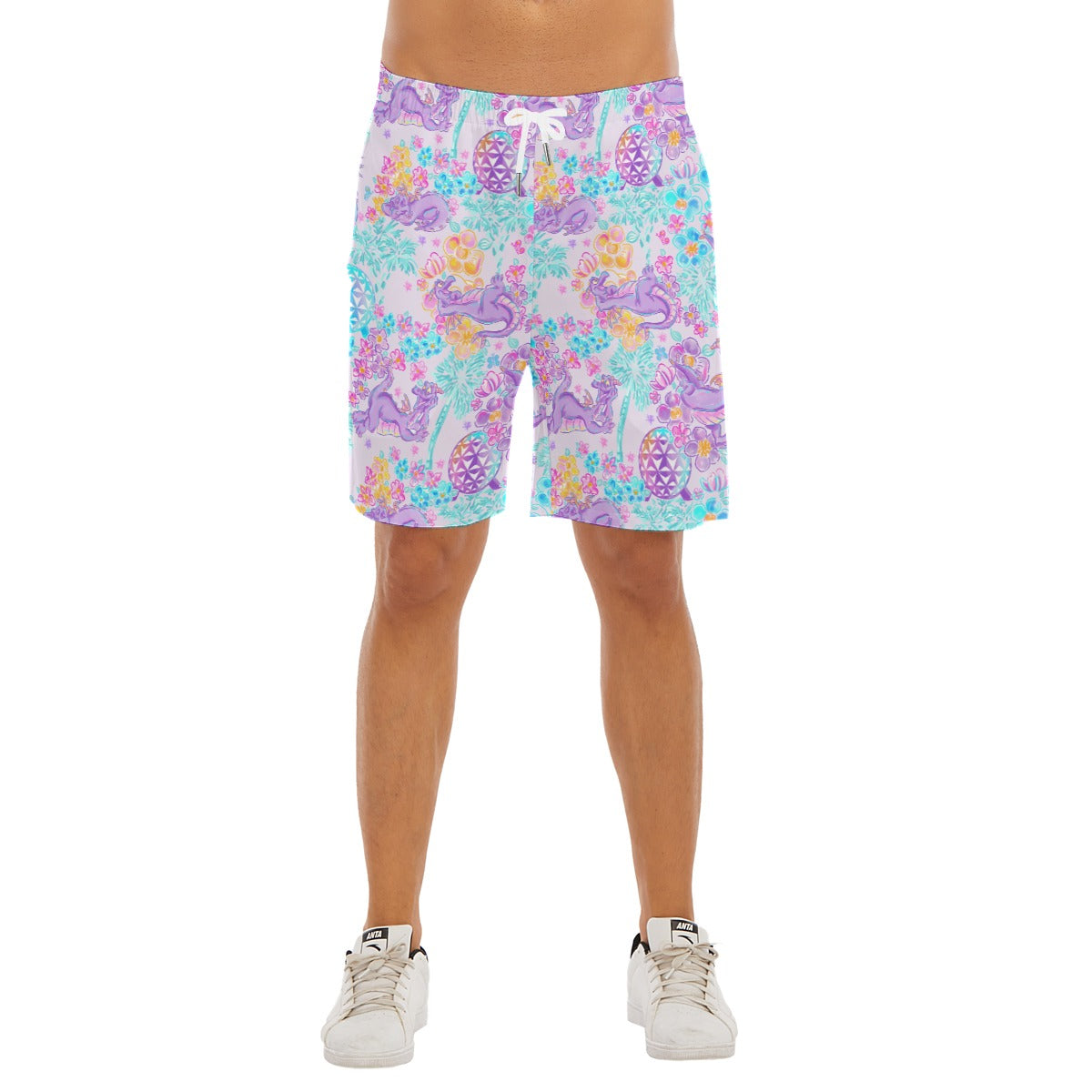 Figment is living his best EPCOT life in this pastel fever dream of blooms and sparkles. The playful purple dragon pops up in a bunch of goofy poses, surrounded by neon watercolor flowers, teal palm fronds, fluttery butterflies, and those iconic geodesic sphere silhouettes glowing in rainbow gradients on a soft lavender background. It feels like imagination got turned up to maximum and then politely refused to calm down.