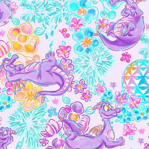 Figment is living his best EPCOT life in this pastel fever dream of blooms and sparkles. The playful purple dragon pops up in a bunch of goofy poses, surrounded by neon watercolor flowers, teal palm fronds, fluttery butterflies, and those iconic geodesic sphere silhouettes glowing in rainbow gradients on a soft lavender background. It feels like imagination got turned up to maximum and then politely refused to calm down.