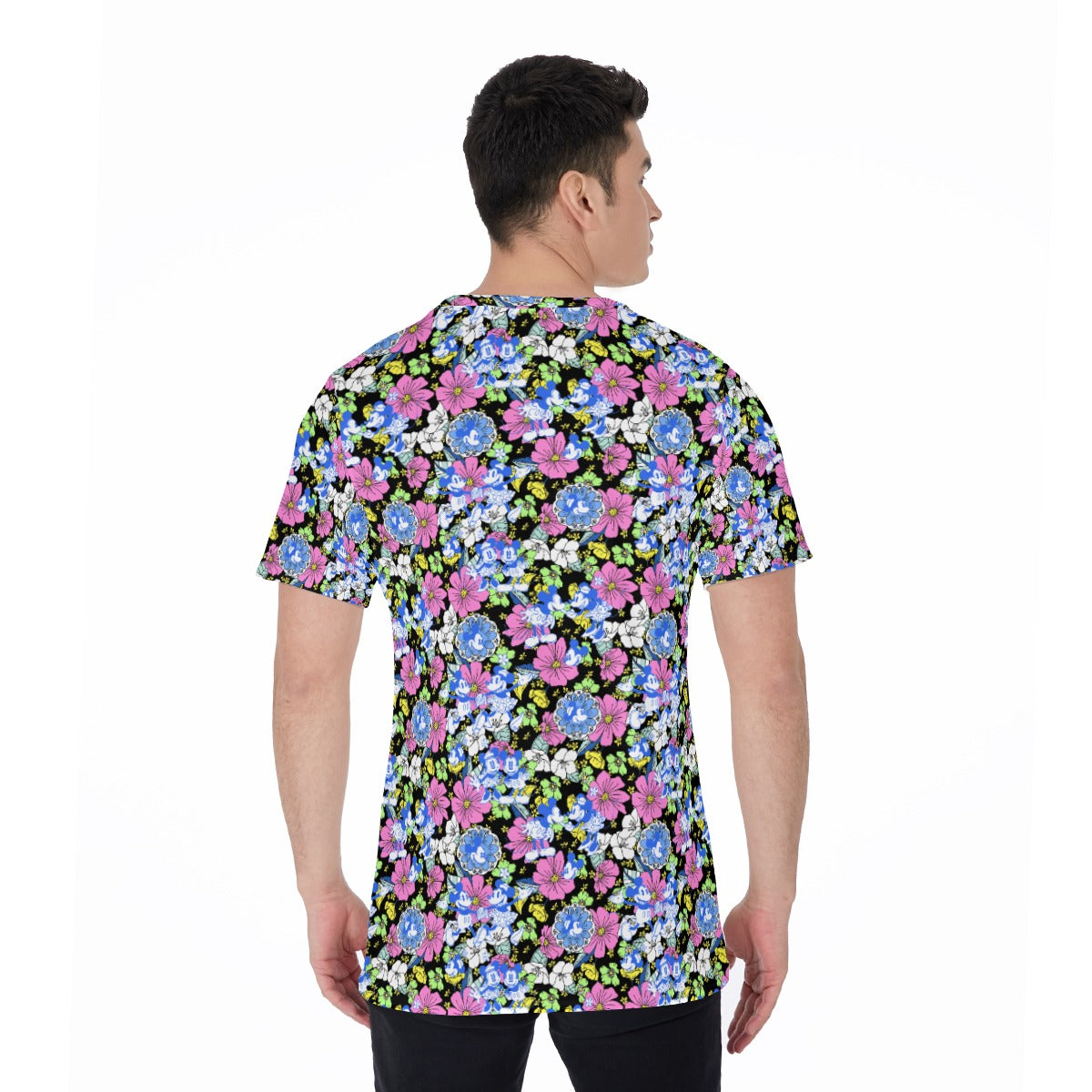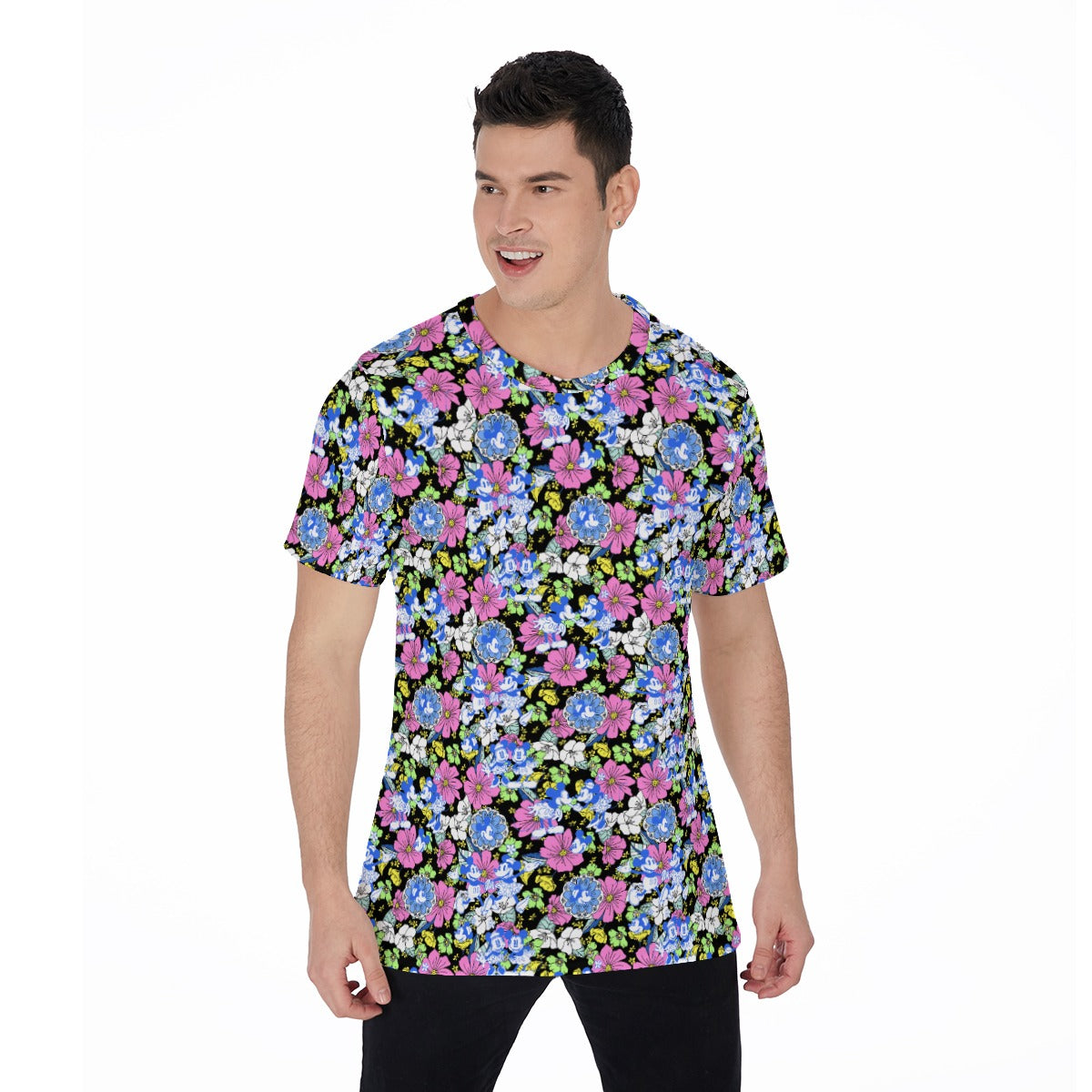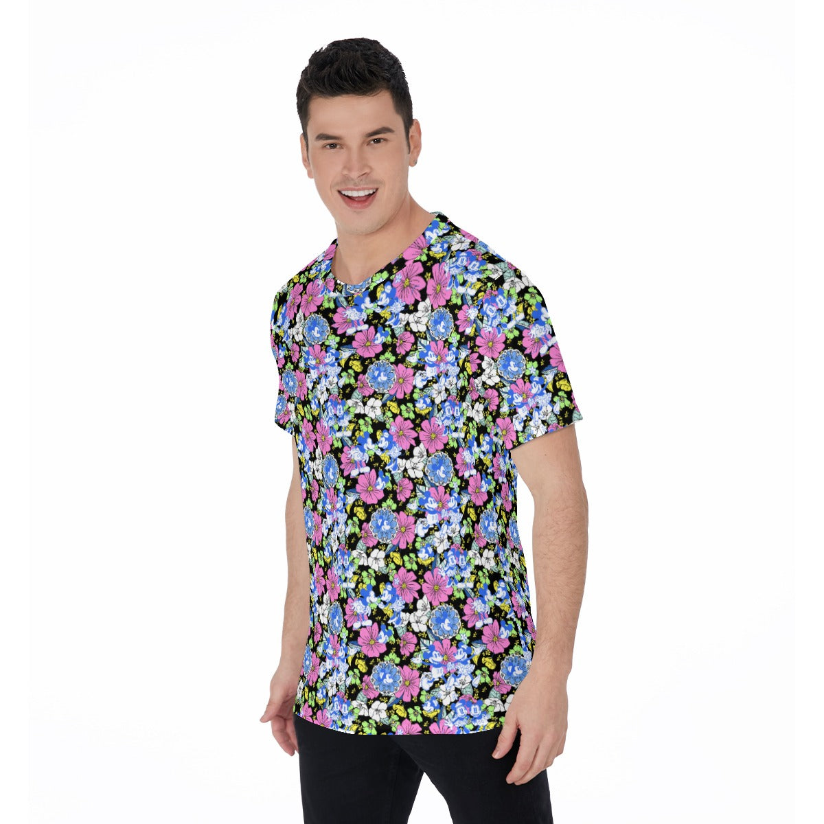 Celebrate classic cartoon charm with this retro floral print featuring two timeless icons dancing amidst oversized blooms in vibrant pinks, blues, and greens. Set against a deep black backdrop, playful flower outlines and joyful poses capture old-school romance and lively adventures—a nostalgic favorite for lovers of vintage animation magic.