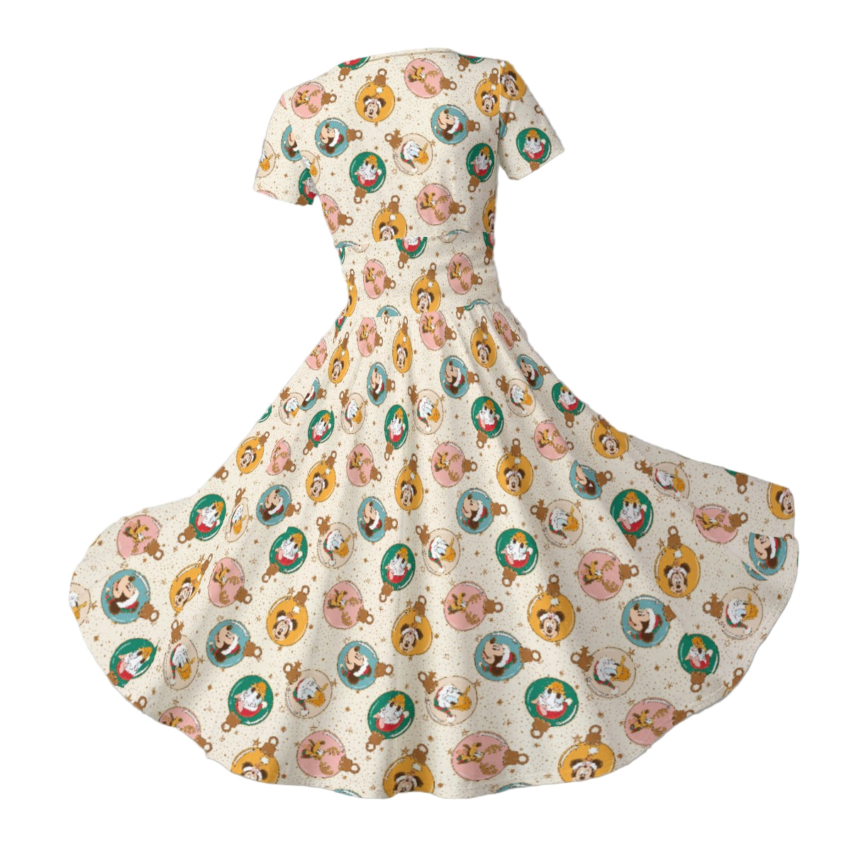 Deck the halls with vintage vibes in this festive print featuring beloved friends tucked into golden Christmas ornaments. With a cozy retro color palette and sparkling stars scattered across a soft neutral background, it’s a holiday hug in fabric form.