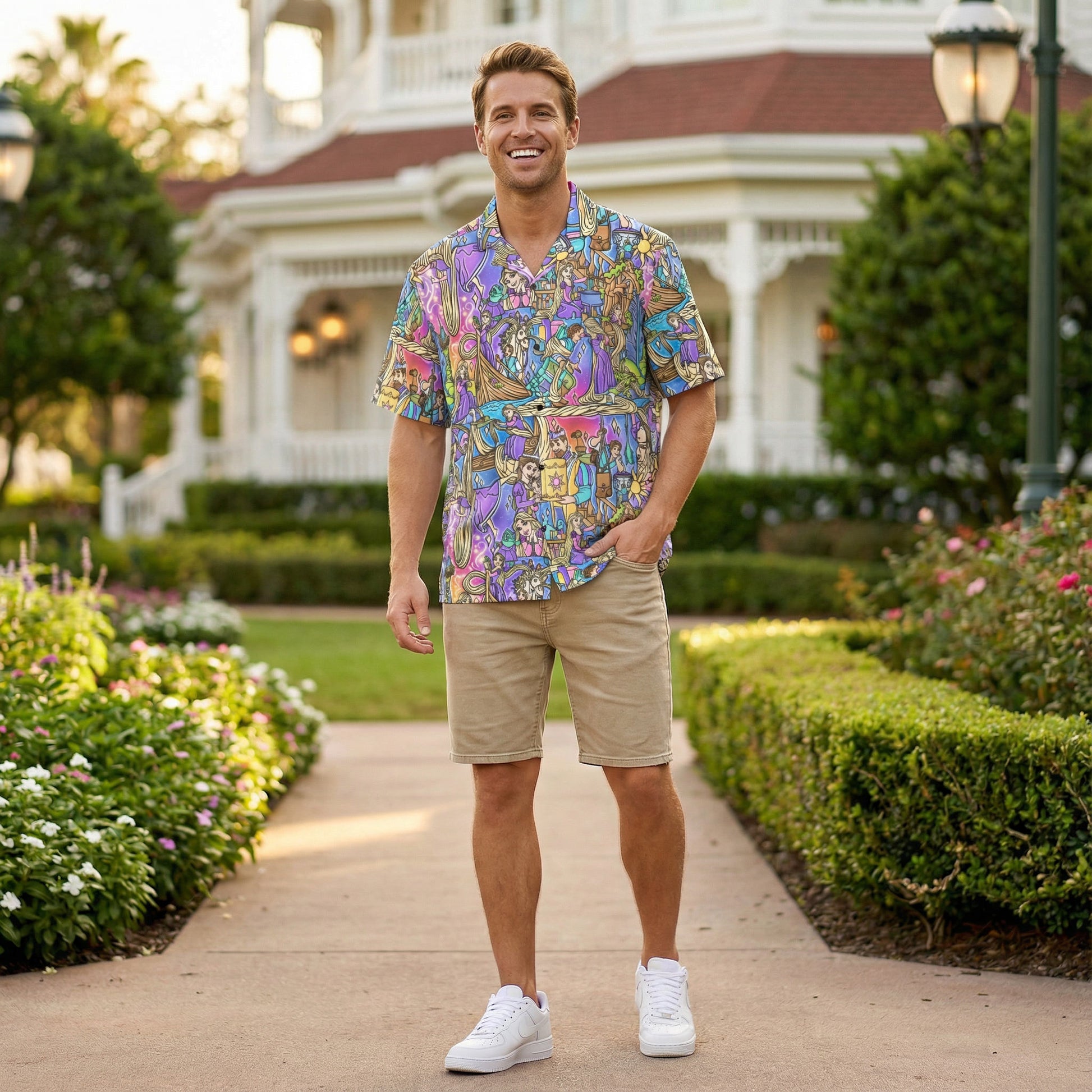 At last, she sees the light! This vibrant collage captures every magical moment from a beloved tower tale: a long-haired princess with impossibly golden locks swirling through every scene, a charming rogue with a signature smirk, a color-changing chameleon, a determined horse, a villainous guardian lurking in the tower, iconic floating lanterns lighting up the night sky, and a golden sun emblem that started it all. The hand-drawn comic book style bursts with bold outlines, rich purples, turquoise, and golden yellows against a dreamy watercolor sky. It's adventurous, it's whimsical, and it's perfect for any fan who knows the best day ever when they see it.