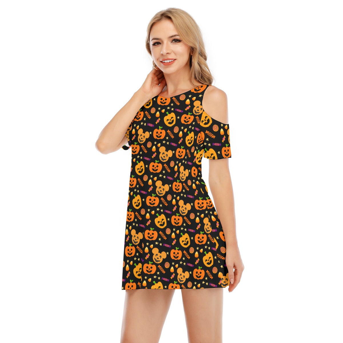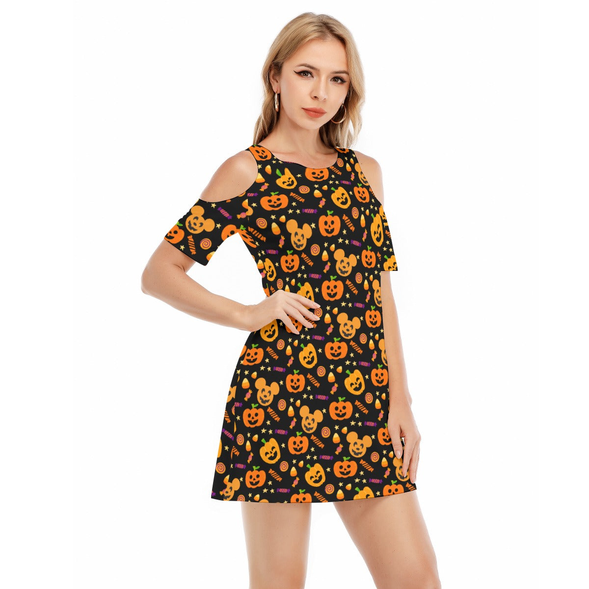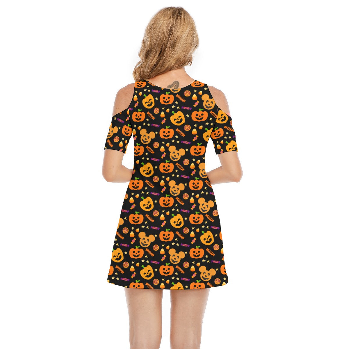 Cheerful Pumpkin Mouse Halloween - Women's Cold Shoulder Cotton Dress