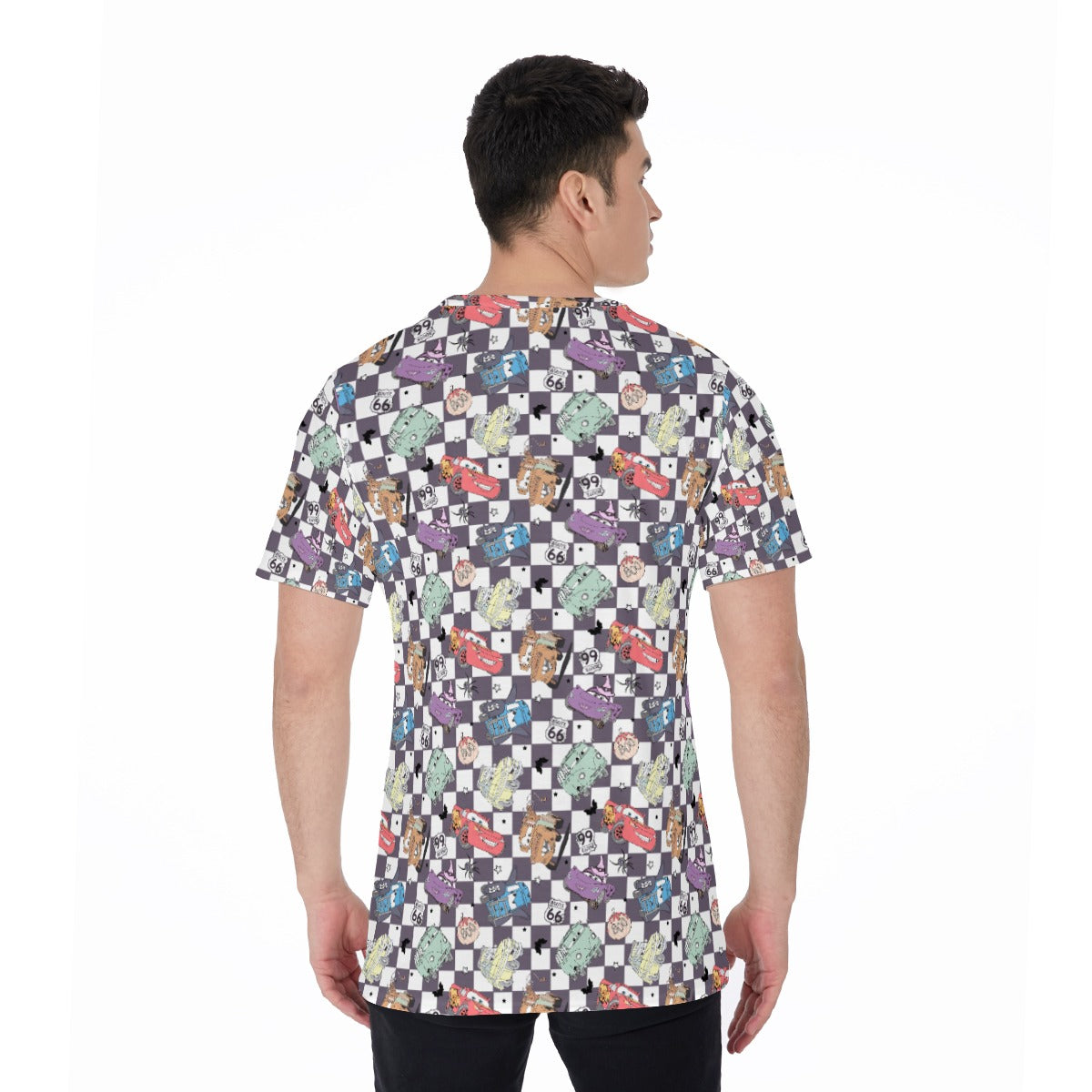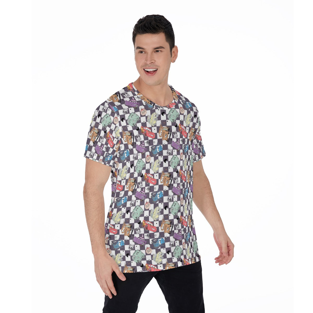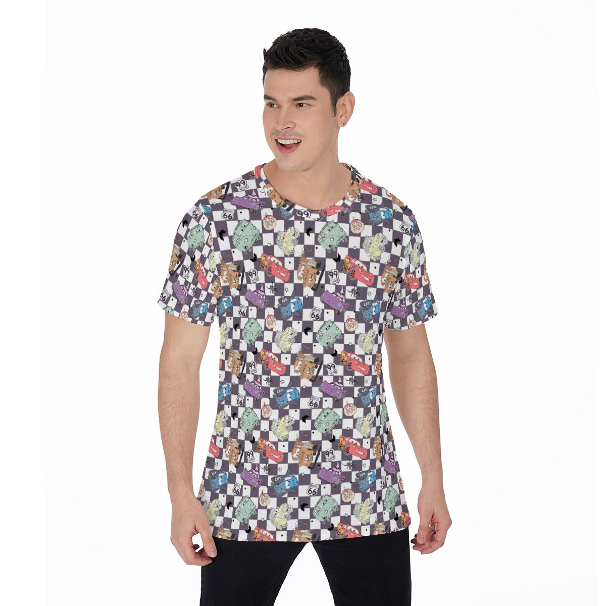 Join the lively race into Halloween spirit with a crew of speedy friends on a checkerboard background. Featuring spooky details like ghost shapes, spiders, bats, and classic road signs, this print turns every drive into a thrilling fall adventure.