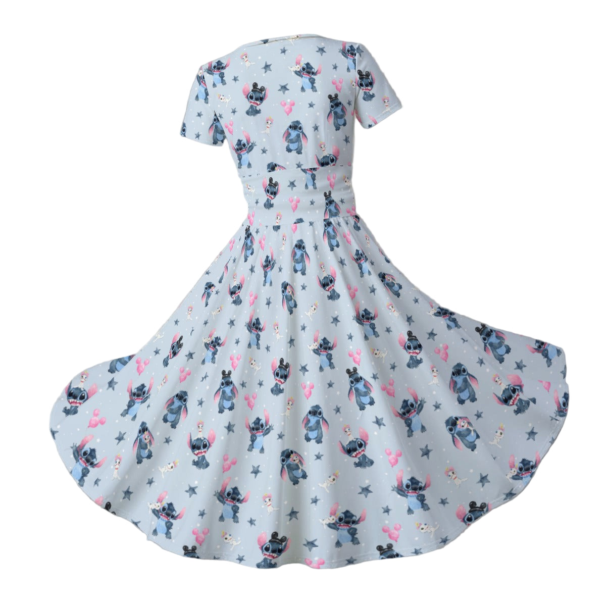 Brighten your day with this cheerful design featuring an adorable blue alien in playful poses and joyful expressions, surrounded by soft pink balloons and twinkling stars on a soothing blue background. Perfect for adding a touch of cute mischief and happiness to any look.