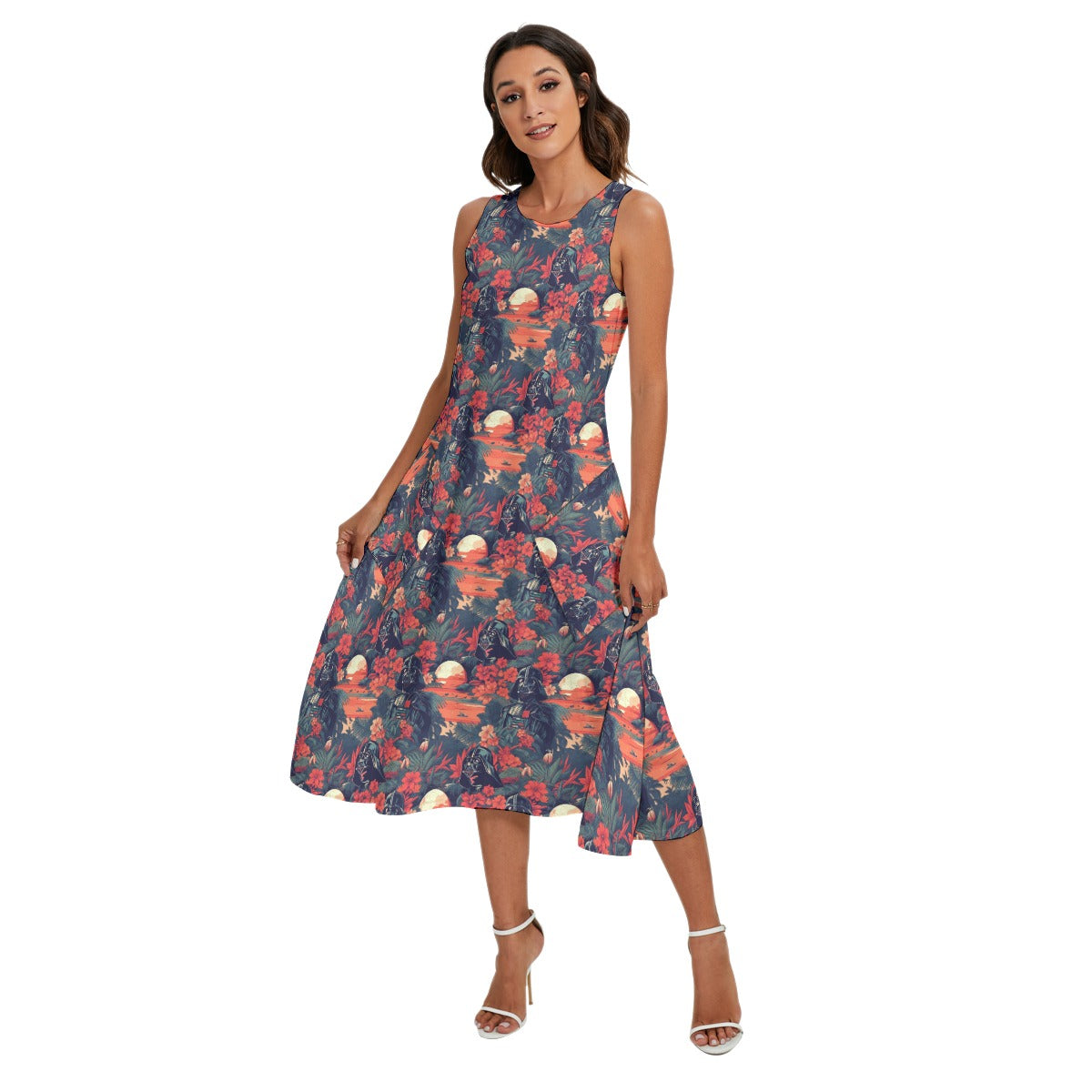 Even the darkest forces need a vacation. This tropical mashup shows a masked figure soaking in island vibes, surrounded by bold red hibiscus blooms, jungle palms, and twin suns setting over a dreamy beachscape. Paradise just got a little more powerful.