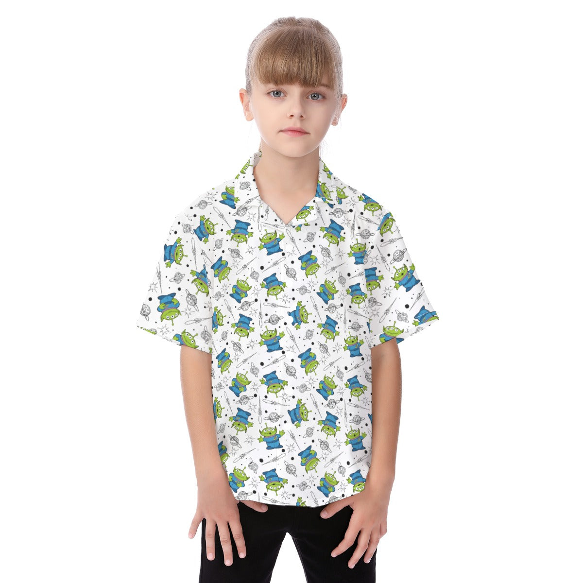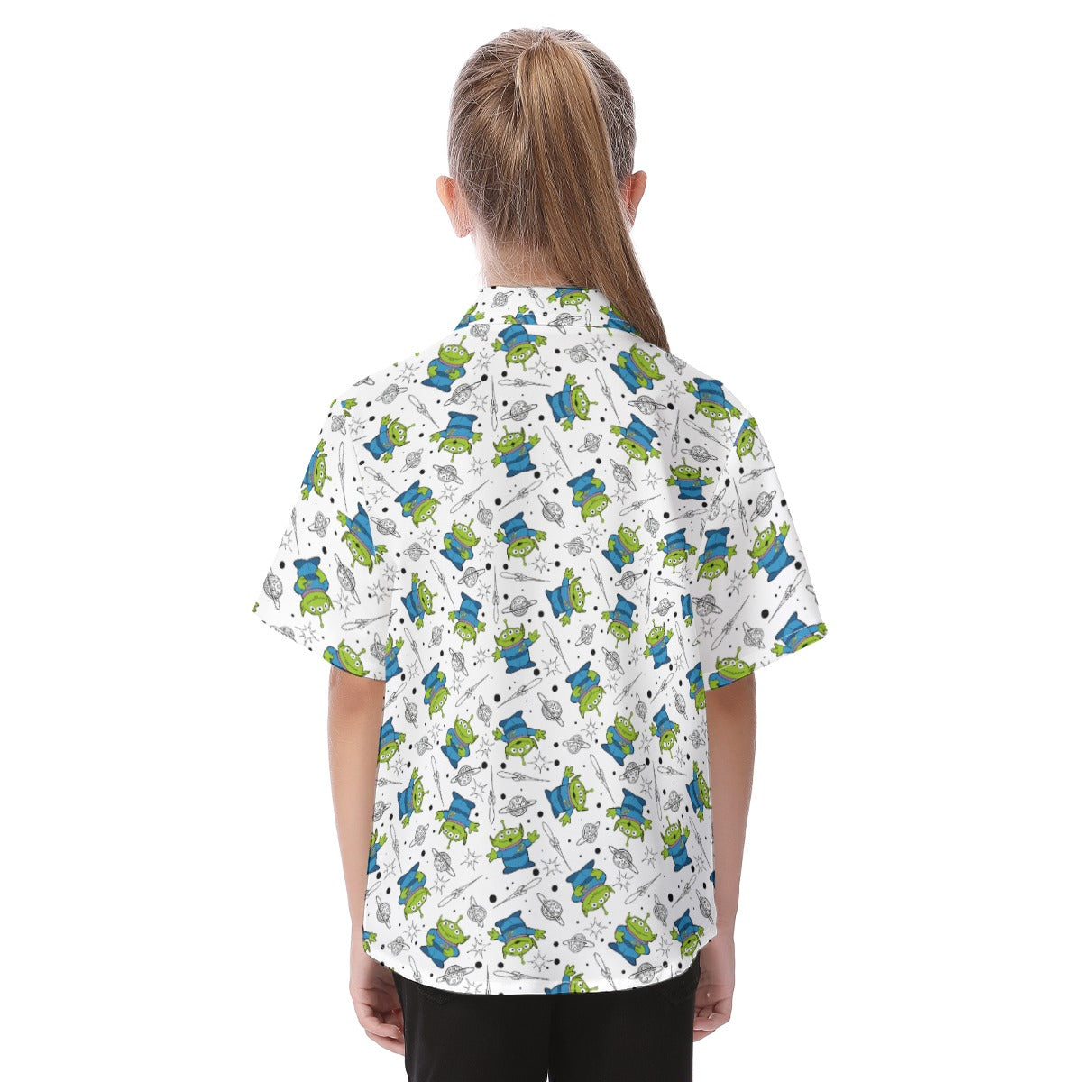 Playful Green Aliens on White - Kid's Hawaiian Button Up Shirt