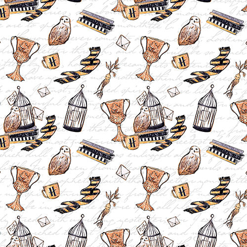 Everything a loyal student needs to thrive through the school year! This pattern features a stack of spellbooks with a faithful owl on top, a yellow house banner with a bold crest, a cozy striped scarf, potion bottles, birdcages, flying letters, and bundles of herbology herbs tied with care. All sketched in a hand-drawn style with pops of golden yellow and black against a clean white background with subtle script. Inspired by a legendary wizarding school, it's warm, it's hardworking, and it's perfect for any badger-hearted fan.