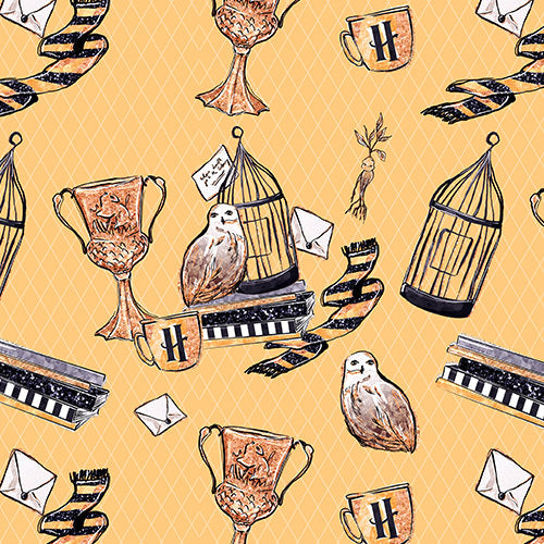 Those patient and true are unafraid of toil! This yellow-and-black house pattern features all the essentials: a loyal owl perched in a birdcage, a trophy cup, a cozy striped scarf, flying letters, herbology bundles, and house banners with a bold crest. All set against a warm golden-yellow background with a soft diamond-quilted texture. Inspired by a legendary wizarding school, it's loyal, it's hardworking, and it's perfect for any badger-hearted fan who knows the value of kindness and dedication.