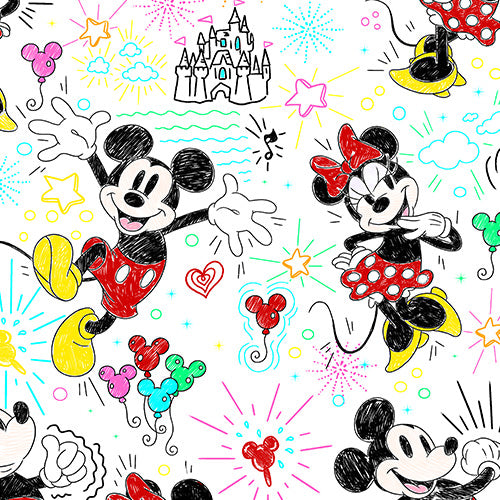 This print looks like someone handed a classic cartoon duo a sketchbook and they immediately chose chaos. A cheerful mouse couple pops up in a hand drawn doodle style, surrounded by fireworks bursts, stars, hearts, balloon shapes, and a fairytale castle floating in the background. The bright pops of red, yellow, and rainbow confetti on crisp white make it feel like a celebration on paper.