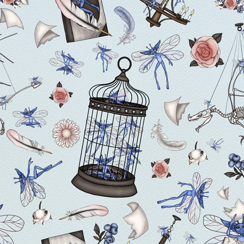 These little troublemakers are everywhere! This pattern features mischievous blue pixies fluttering around vintage birdcages, delicate feathers, pink roses, and other whimsical details. The hand-drawn watercolor style on a soft pale blue background gives it an elegant, storybook feel—even if these little creatures are anything but well-behaved. Inspired by a beloved magical saga, it's playful, it's enchanting, and it's perfect for any fan who remembers a certain disastrous classroom lesson.