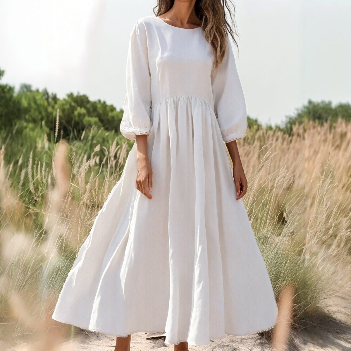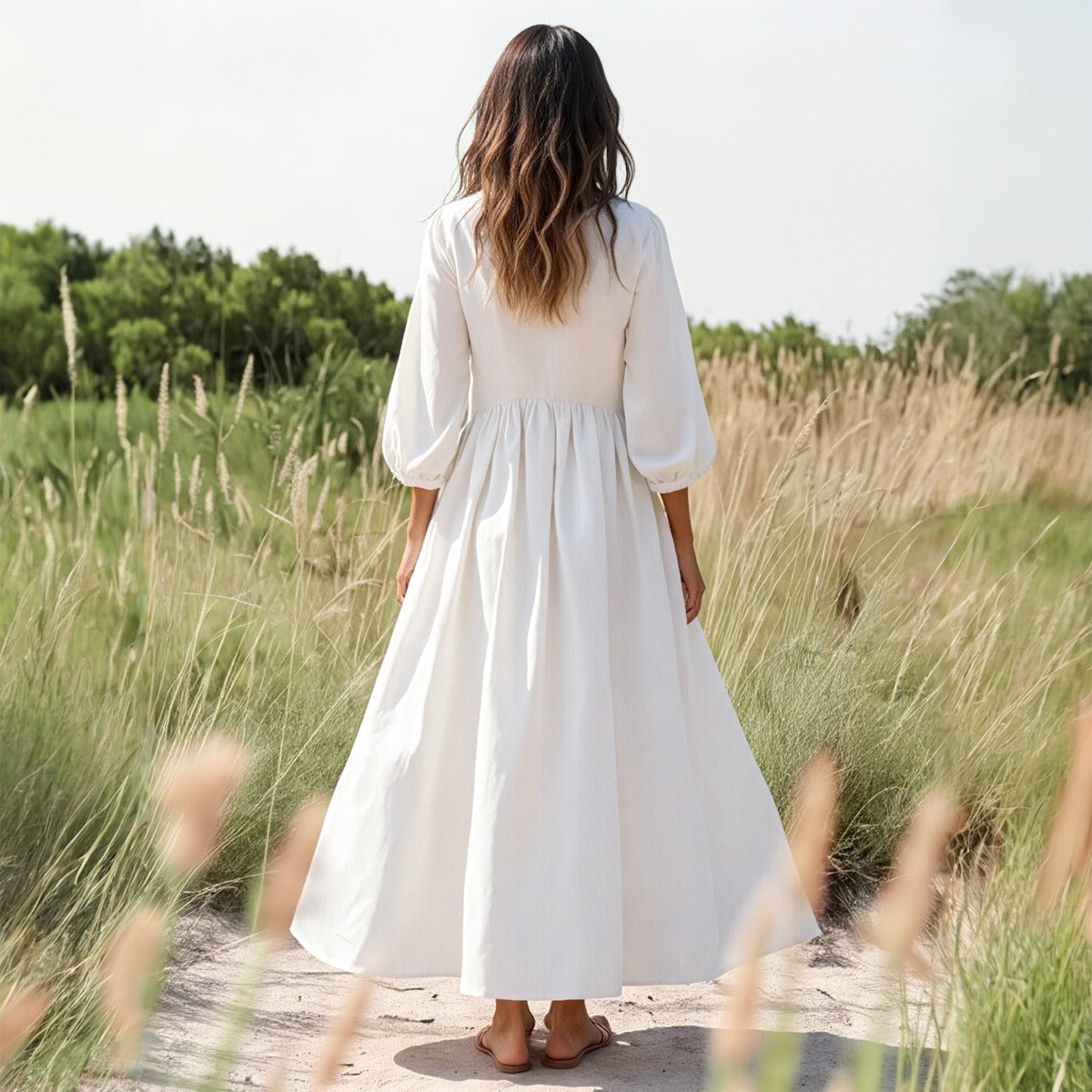 The textured slub fabric gives it a natural, easygoing feel (without any stiffness), while the puffed three-quarter sleeves and full-length hem add just the right amount of romance. It’s an ideal pick for dreamy photoshoots, everyday strolls, or those golden-hour moments on vacation.