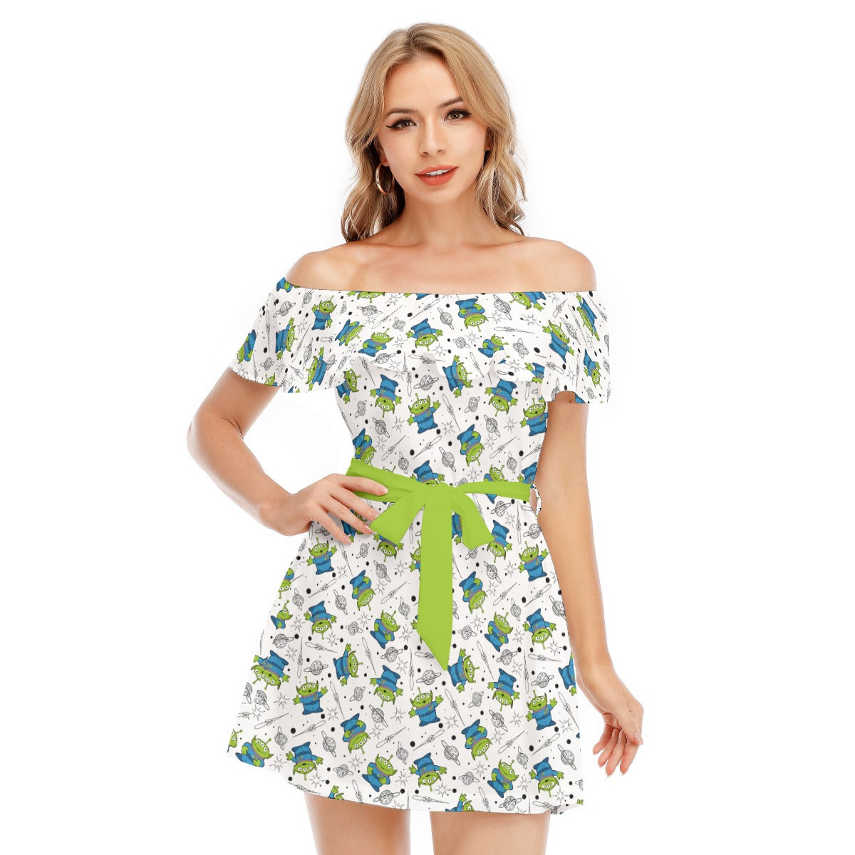 Playful Green Aliens on White - Women's Off-shoulder Ruffle Dress