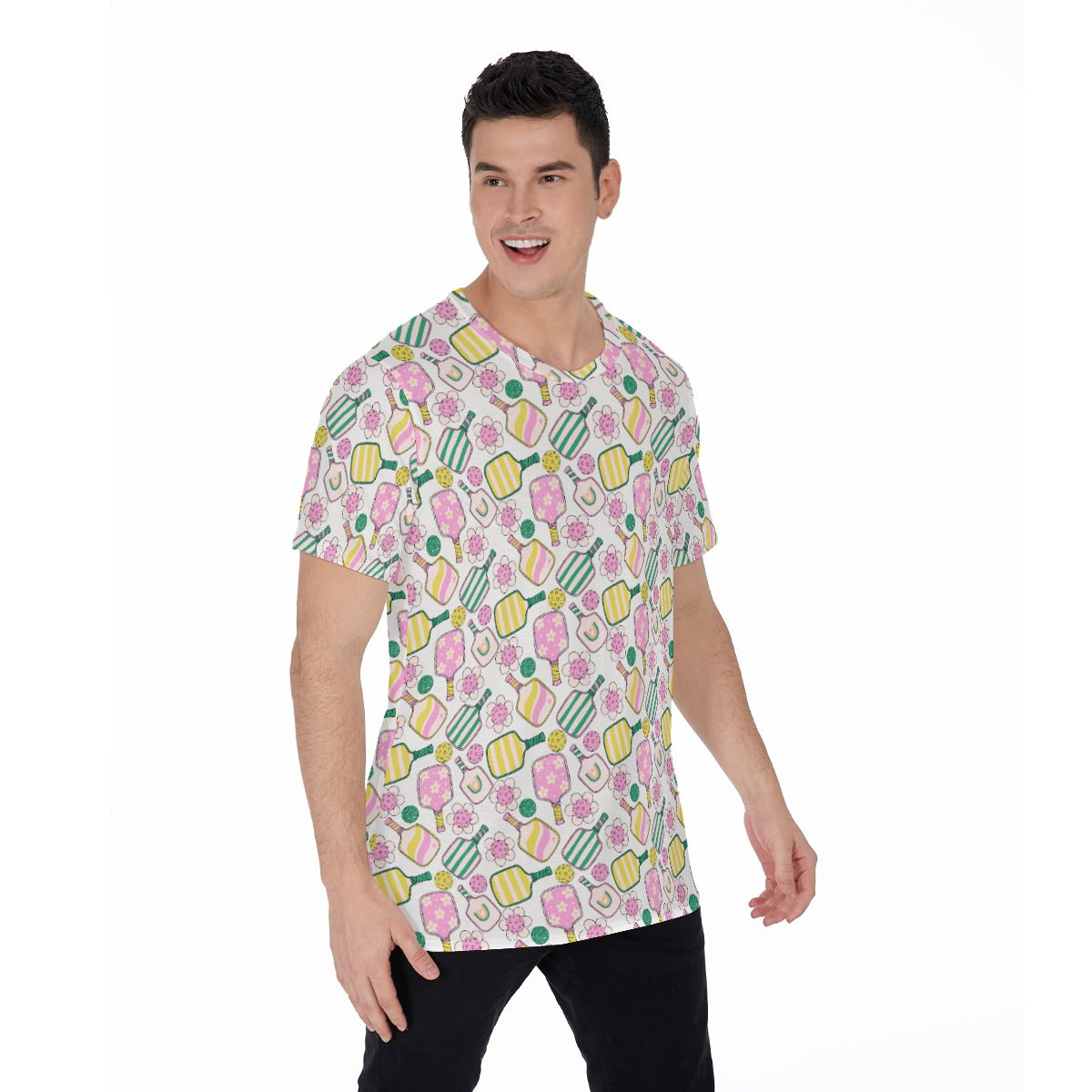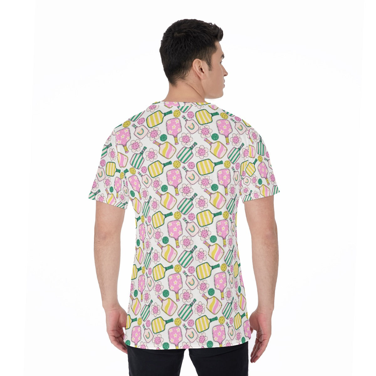 Brighten your game with this cheerful pickleball print featuring pastel paddles in pink, yellow, and green, paired with playful balls and daisy-style florals. A whimsical, sporty design full of fun and flair.
