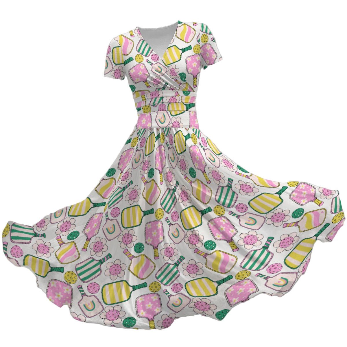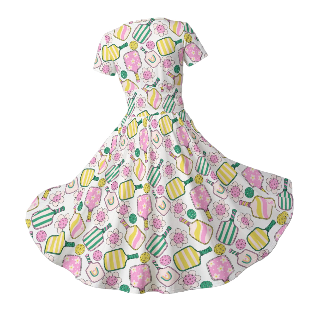 Brighten your game with this cheerful pickleball print featuring pastel paddles in pink, yellow, and green, paired with playful balls and daisy-style florals. A whimsical, sporty design full of fun and flair.