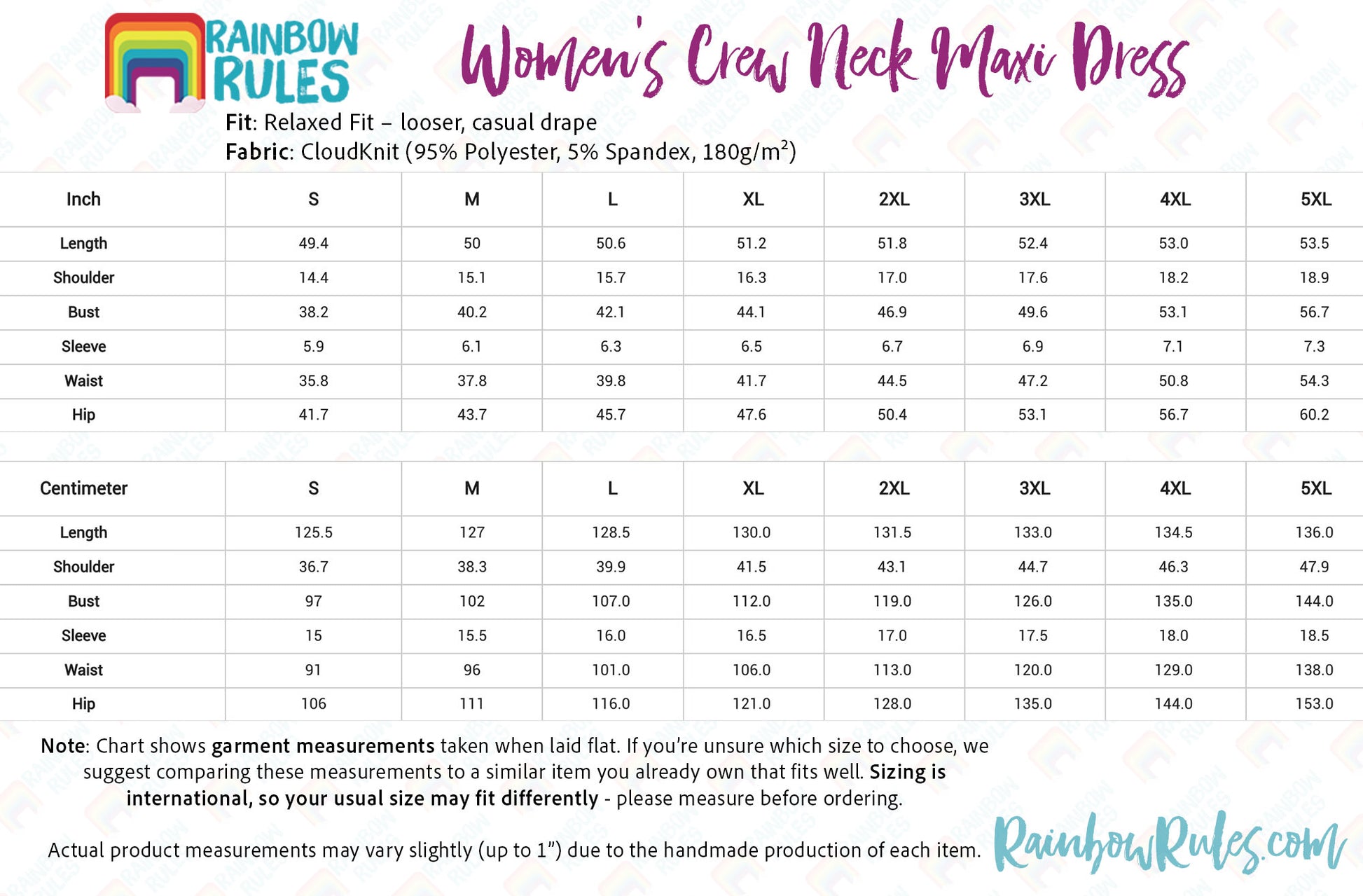 Size Chart - Women's Crew Neck Maxi Dress